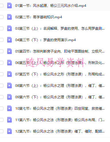 内容包括四大化解法之第二化解法、杨公风水之形(形理法课)、十大理之第一大理、六大忌之第六大忌、四大化解法之第二化解法、四要之杨公穿房断、室内布局实例讲解!!!