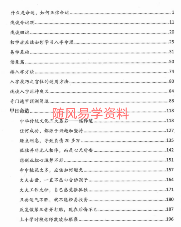到底是什么原因造成的?从一开始我对术数的执着,到后来对佛理的探索,也渐渐的明白,何为命运,以及如何去改变我们的命运。故从2016年开始,我就逐渐的改变自己的笔锋,从易理分析入手使人生信,再从佛理开始劝导,使人破迷。直到2018年,我彻底的明白了一些道理,也让自己的文章彻底的不同。从一开始的专注于术数到后来对道的追求,以及对道的传播,这么多年,我一直坚持着,坚持着抽选文章,坚持着分享智慧。虽然从我个人角度来讲,早已不用再如此辛苦。但为了让大家能真正明白,什么是命运,以及如何面对自己的命运,如何去改变自己的命运,如何化解生命中遇到的诸多痛苦,我依然选择笔墨不断。虽然自己在探索真理的道路上才刚刚开始,但在分享的过程中,我也得到了不少的收获。有时一句话,不仅仅是能唤醒世人对一些事物的执迷,同时也唤醒了我,从睡梦中慢慢醒来。我的文章,早已不是简单的案例分析,而是无数人的精神食粮,也包括我自己,也需要它来滋润和营养。为了让这些文字能得以保存,能作为枕边书,时刻提醒自己,通过别人的故事,来审视自己的人生。故从2019年开始,就筹划着整理案例编辑成书,直到2022年,历时三年,才得以完成。其中每一个案例,都是我的心血结晶,每一篇文章代表着一个日夜,代表着当时那颗发有大愿真诚传法的心。在2020年,因为一些困难,本想放弃,但有许许多多的朋友留言,希望能有这样一本书,不仅仅用于收藏,更主要是用于提醒自己,我很幸福,也很幸运。此书汇聚了近两百个案例,当然这只是3000案例中的很少一部分,每一个案例,都是真实的,不仅可以作为学习命理学的参考书,也可以作为修心的枕边书。很多时候,当为一件事计较烦恼时,说不定其中的某一个故事,就能唤醒自己,从烦恼苦海中解脱出来。我最希望的,并不是大家能从中学到多少易学知识,而是能从中找到自己的价值,寻找到自己的人生意义,懂得感恩,懂得知足。能快快乐乐的过好一生,能平平安安的走完一生。